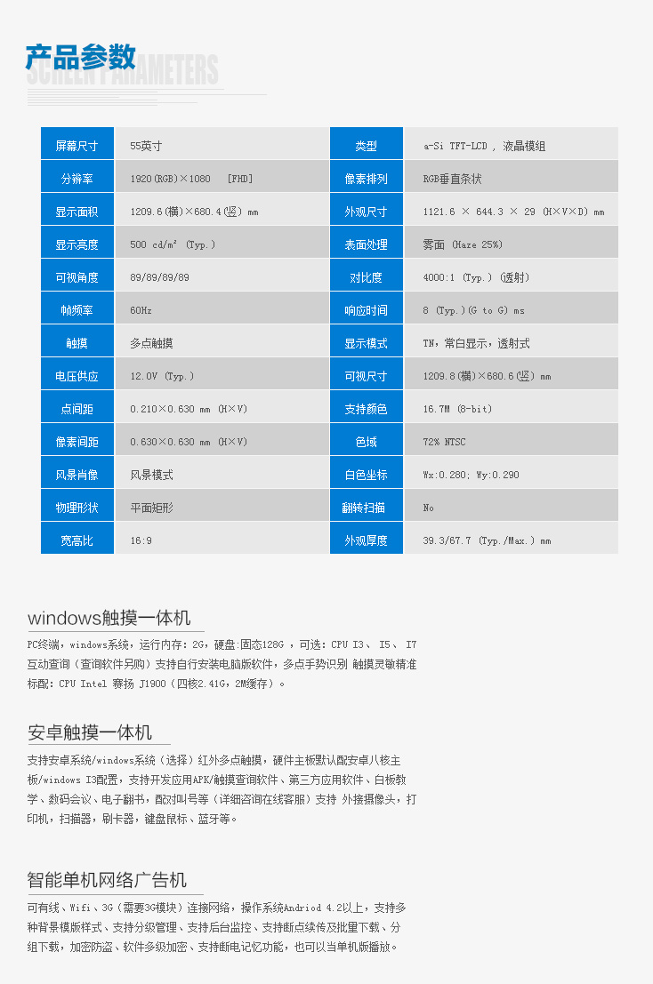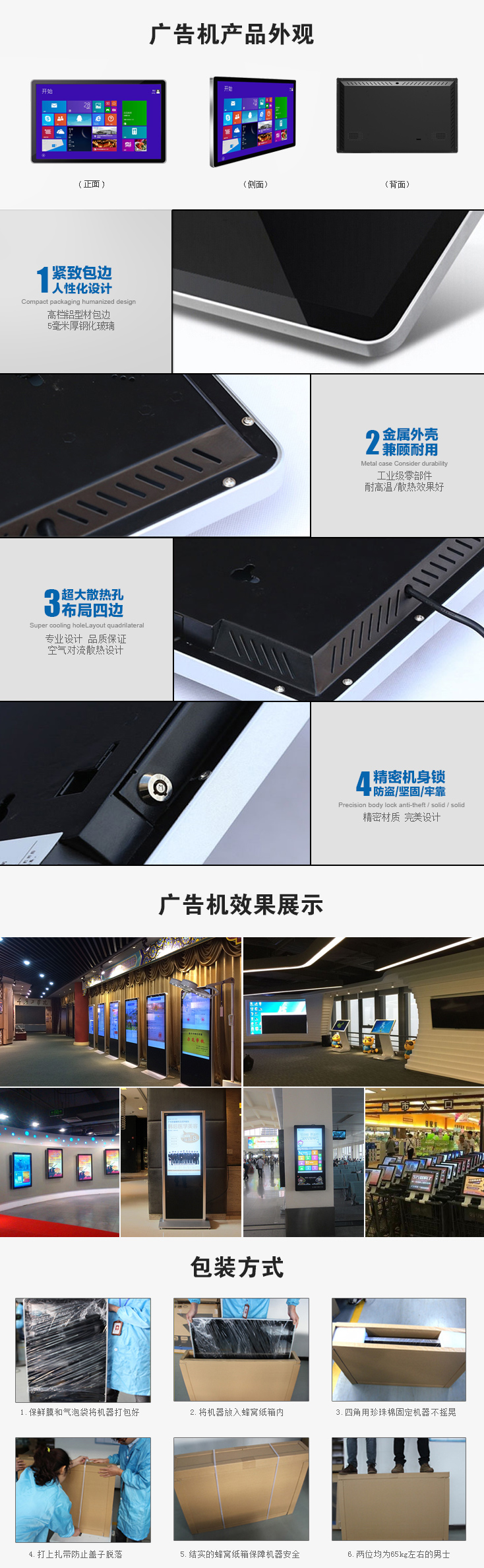 1、外殼選用優(yōu)質(zhì)金屬材料制作,表面并經(jīng)噴粉工藝處理;外殼顏色以,黑,銀色為主,面帶亞克力面板防刮傷。可根據(jù)客戶要求定做;采用后背墻掛方式。