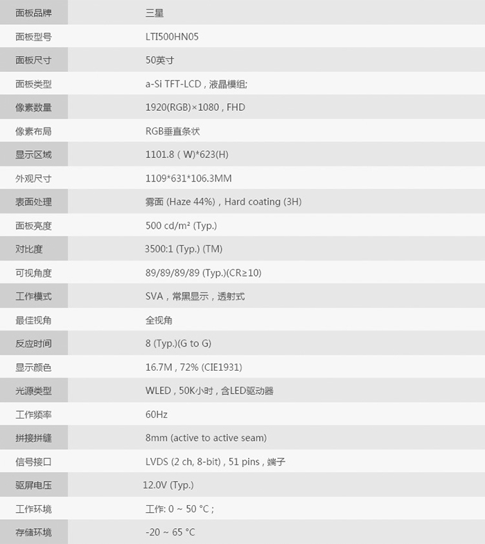 面板壽命              above 50000小時