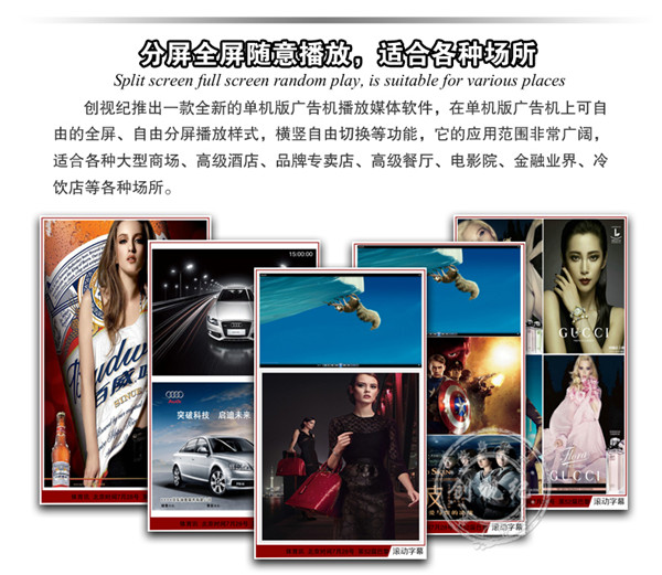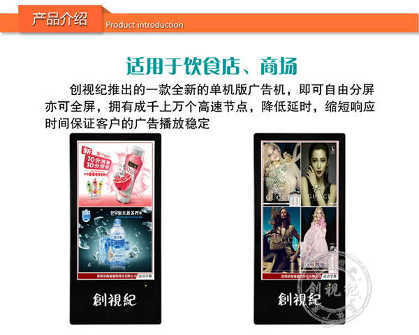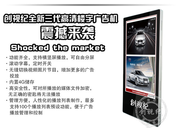 對(duì)比性 | 看家本領(lǐng): ★成本低,能滿足常規(guī)的廣告機(jī)播放功能; ★高清1080P視頻、圖片播放; ★一鍵拷貝節(jié)目、支持 HDMI接口輸入,可當(dāng)顯示器之用。不足之處:豎屏片源需要第三方軟件制作、剪輯。分屏制作繁瑣。 | 看家本領(lǐng): ★解決客戶橫豎屏轉(zhuǎn)換問題,可自動(dòng)對(duì)應(yīng)機(jī)器旋轉(zhuǎn)視頻; ★內(nèi)置4G內(nèi)存,烤貝快、播放穩(wěn)定、永不卡殼; ★真正客戶自由分屏,真正的實(shí)現(xiàn)視頻,圖片,字幕,日期的隨機(jī)組合;想怎么分就怎么分; ★目前唯一能真正實(shí)現(xiàn)節(jié)目之間的無縫切換的方案; ★疊加背景圖片,使畫面更美觀; ★雙芯片、真正1080P的全高清解碼;目前只有我們和分眾傳媒使用此方案。 | 看家本領(lǐng): ★遠(yuǎn)程控制、管理、下發(fā)節(jié)目; ★兼容更多格式,天氣預(yù)報(bào)等,內(nèi)容豐富,操作so easy! ★后臺(tái)軟件功能強(qiáng)大,關(guān)鍵點(diǎn)是穩(wěn)定,支持同時(shí)上萬終端在線; ★隨機(jī)搭配服務(wù)器安裝軟件; ★擴(kuò)展性強(qiáng)、可安裝任意APP,滿足你的任何任性; ★支持阿里云服務(wù)器,強(qiáng)大的技術(shù)支持。真正的廣告媒體運(yùn)營最佳選擇,穩(wěn)定壓到一切。不足之處:暫時(shí)沒有(這個(gè)可以有,這個(gè)真沒有...) |