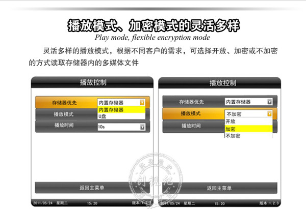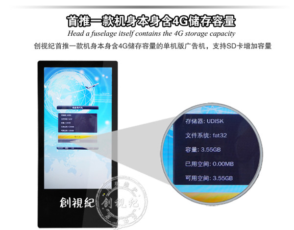 控制方式 | 通過U盤,SD卡播放播放 | 通過U盤,SD卡更新節(jié)目,直接將內(nèi)容導(dǎo)入機(jī)器內(nèi)存,(內(nèi)置4G 內(nèi)存)優(yōu)點(diǎn):客戶無需另配內(nèi)存卡;拷貝速度快 | 通過電腦用網(wǎng)絡(luò)(支持有線,wifi,可選3G)連接廣告機(jī),電腦后臺(tái)統(tǒng)一遠(yuǎn)程控制、管理 |