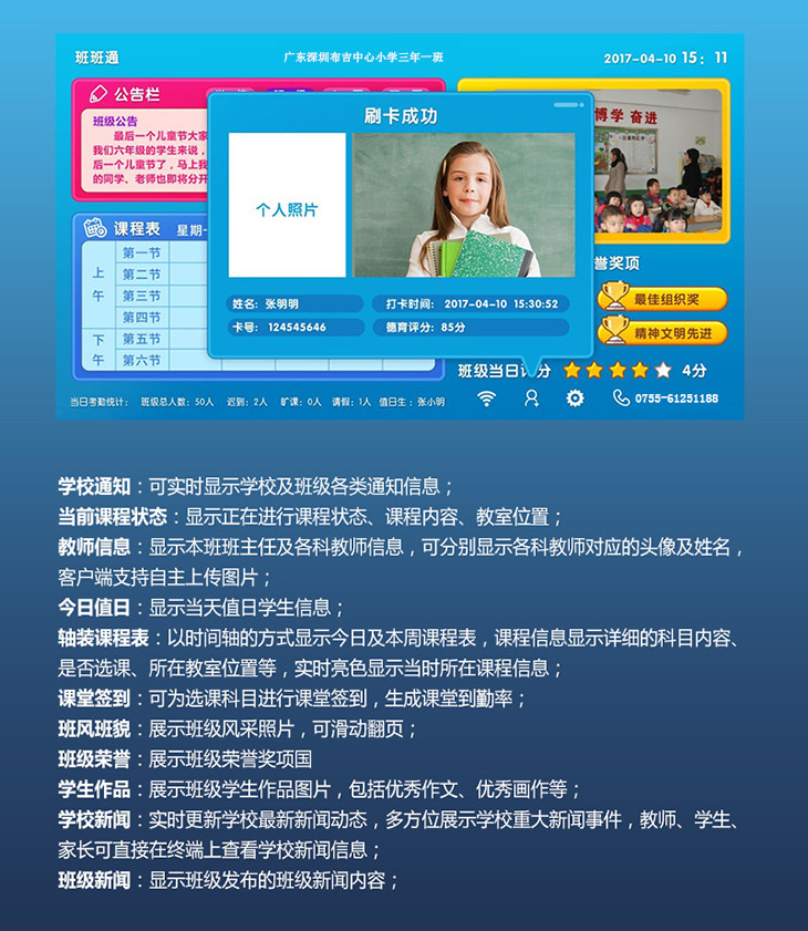 - 基礎(chǔ)數(shù)據(jù)庫(kù)系統(tǒng)是按照教育行業(yè)設(shè)計(jì)的標(biāo)準(zhǔn)數(shù)據(jù)庫(kù),包括學(xué)校信息、教師信息、教室信息、學(xué)生信息、課程信息、班風(fēng)班貌、德育評(píng)價(jià)、考試信息、考勤信息等,通過(guò)建設(shè)基礎(chǔ)數(shù)據(jù)庫(kù)系統(tǒng)可為教育信息化建設(shè)打造堅(jiān)實(shí)基礎(chǔ)。產(chǎn)品備注:電容觸摸,可選擇帶刷卡功能或不帶刷卡功能,備貨尺寸:15.6寸、18.5寸、21 5寸,其他尺寸可訂做。