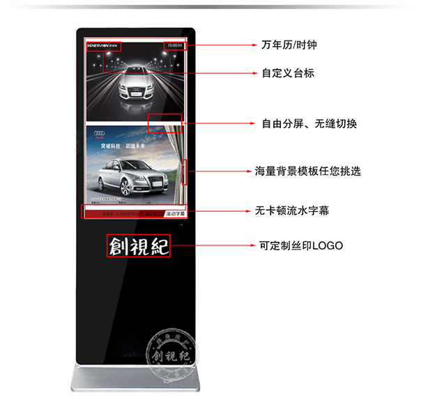 支持橫豎屏任意分屏,可以實現(xiàn)1個視頻+4個圖片+1個滾動字幕+1個logo+1個日期+1個時間+1個背景。