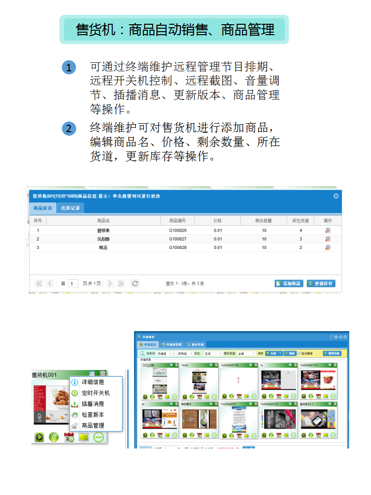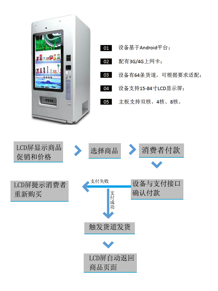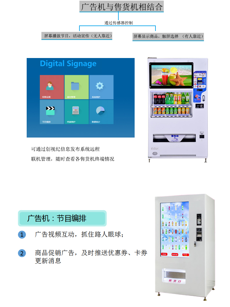 設(shè)備不僅僅具有售貨功能,更能遠(yuǎn)程聯(lián)機(jī)對各終端進(jìn)行操作和管理,同時(shí),個(gè)性的LCD廣告顯示屏播放商品廣告,及時(shí)推送消息,更具多元化、高定制化的特點(diǎn)。贏得眾多商家的喜愛,