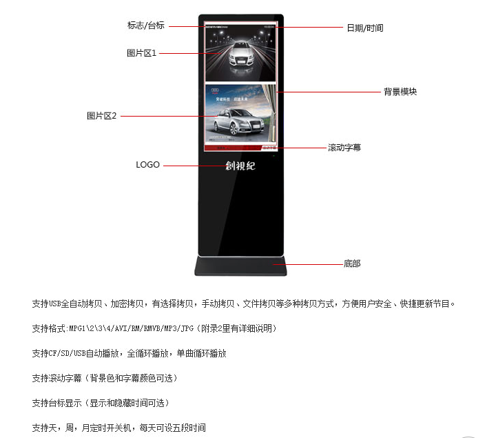 作為新一代的智能設(shè)備,它的誕生就是為了改變廣告被動的傳播模式,通過一個互動的方式來吸引更多的顧客主動去瀏覽廣告。這一互動性也使得廣告機具備了很多的公共服務(wù)功能。利用廣告機通過文字、音視相交互在液晶屏上進(jìn)行信息傳播已成為主流,所展示的廣告更具生動性和創(chuàng)造性。同時,廣告機的使用還具有時域性、多媒體行、成長性、超前性、高效性、經(jīng)濟(jì)性和技術(shù)性。