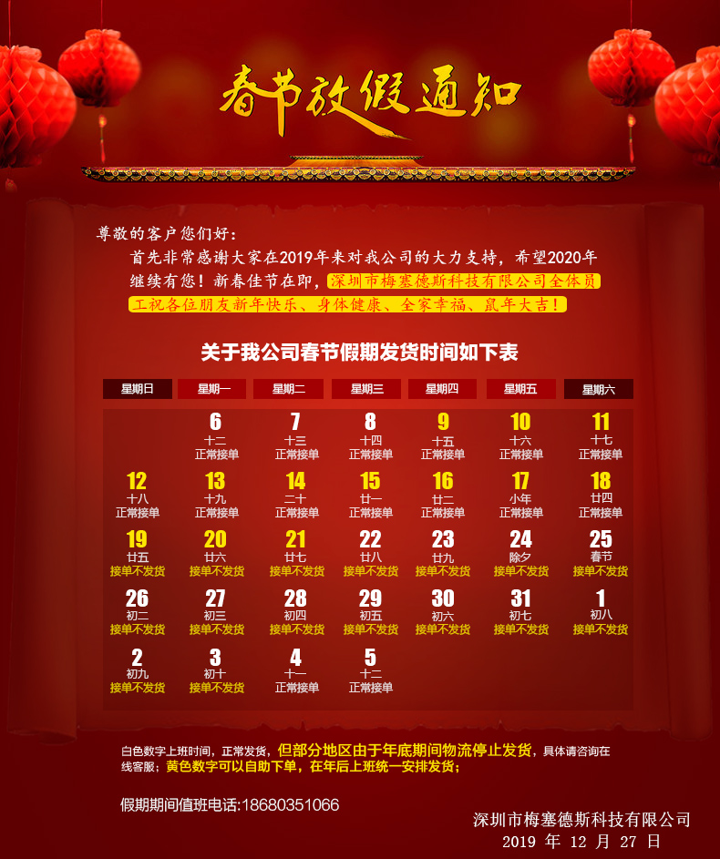梅塞德斯科技春節(jié)放假通知出來(lái)了,祝大家新年快樂(lè),身體健康,生意興隆!